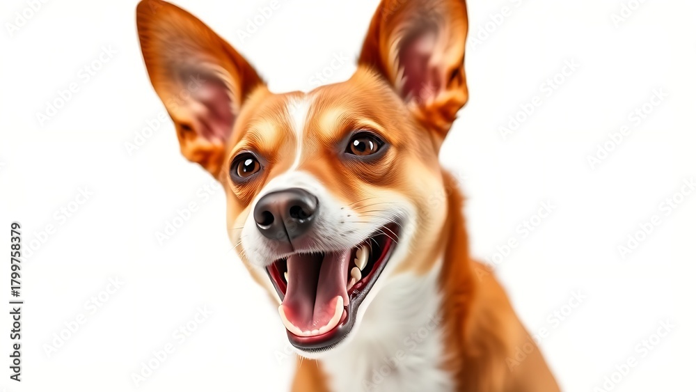basenji. Adorable basenji dog with brown and white fur, joyfully posing against a white backdrop. wildlife magazines, conservation campaigns, designed for eco-tourism storytelling. #1799758379