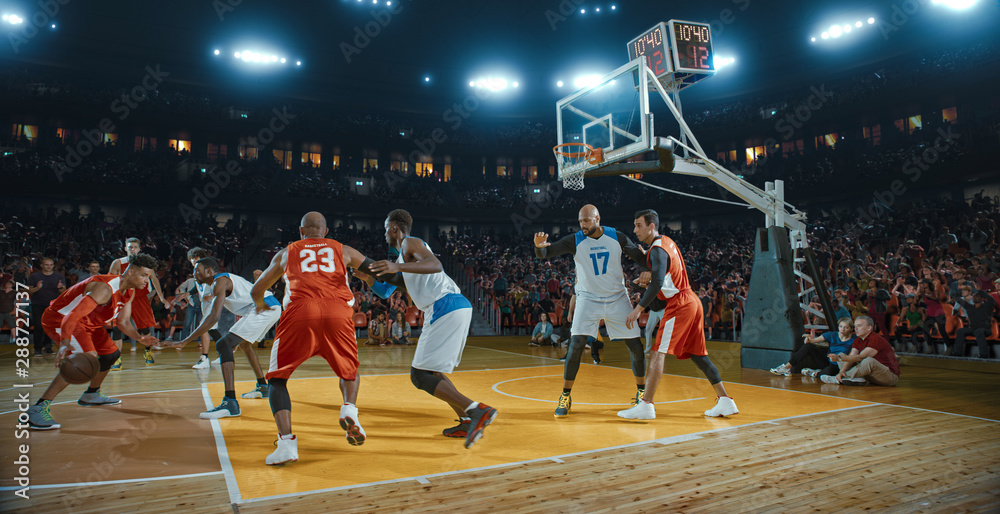 Basketball players on big professional arena during the game. Tense moment of the game. Celebration #288727137
