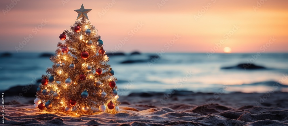 Beachside Australian Christmas tree adorned with fairy lights blurred background perfect for messaging #652867035