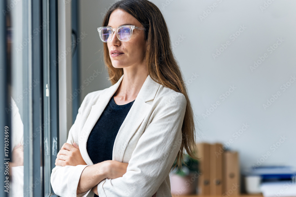 Beautiful businesswoman taking a break while looking forwards to the window at the office. #1770376919