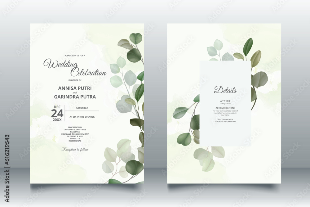 Beautiful eucalyptus leaves wedding invitation card template Premium Vector #616219543