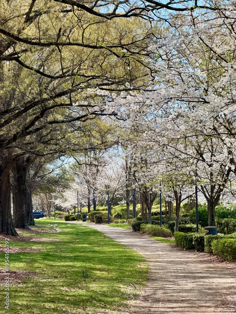 Beautiful sidewalk path amongst blooming cherry trees #1954165792