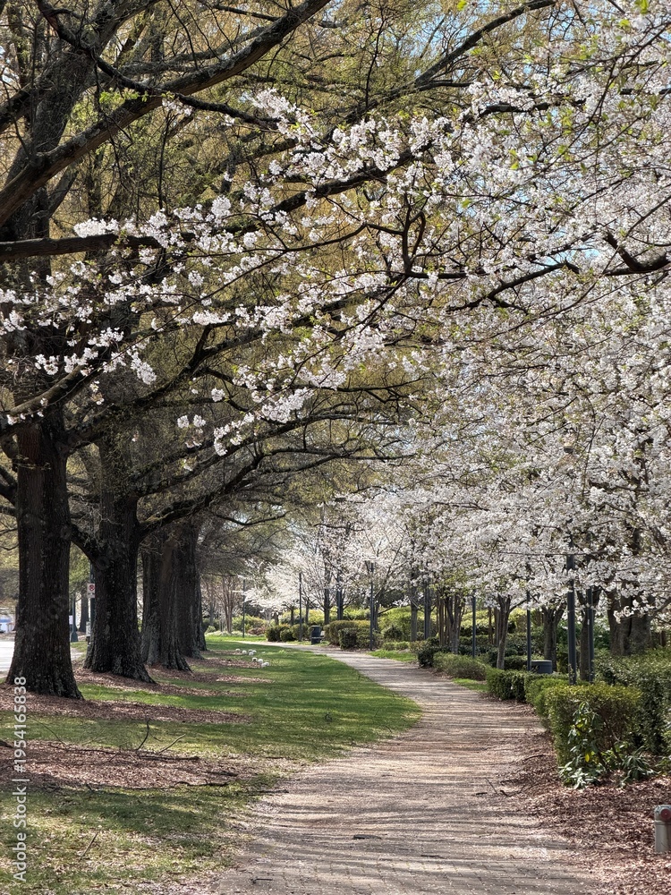 Beautiful sidewalk path amongst blooming cherry trees #1954165838