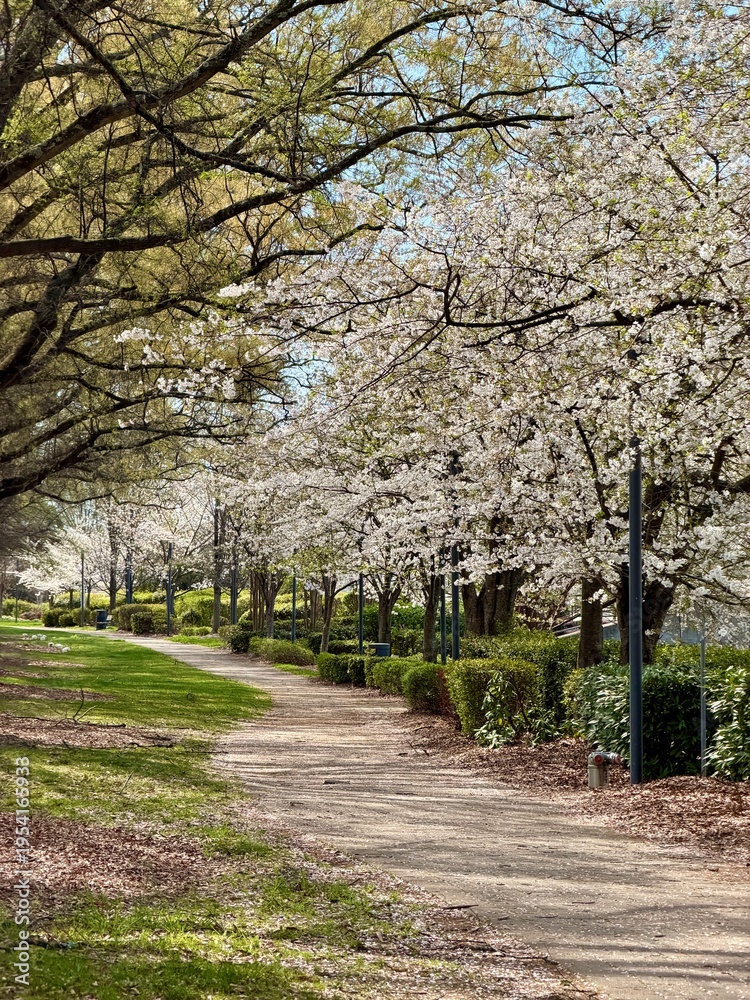 Beautiful sidewalk path amongst blooming cherry trees #1954165933