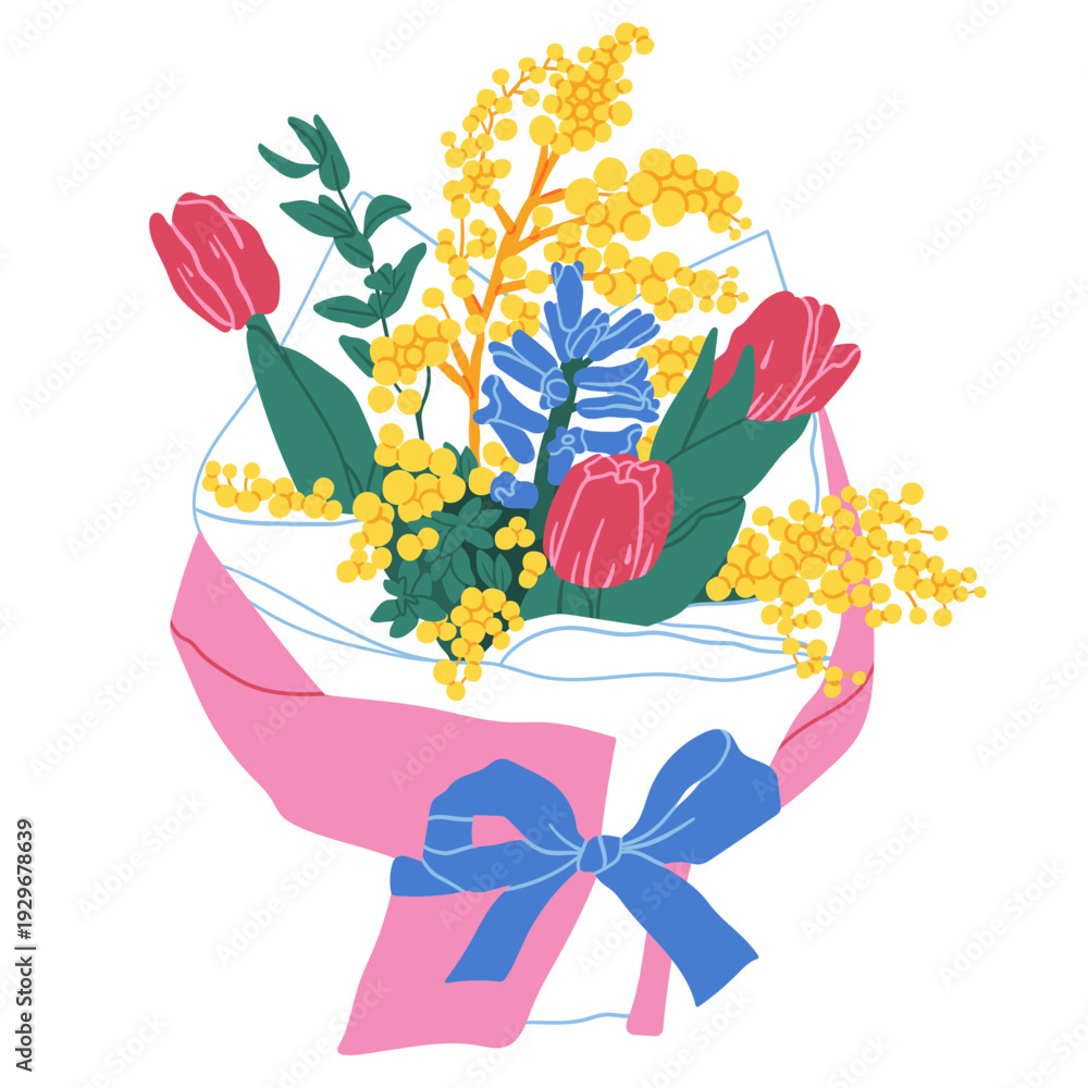 Beautiful Tulip, mimosa bouquet. Spring fresh flowers wrapped in gift paper with ribbon. Hand drawn trendy Vector illustration. Isolated floral design element. Invitation, card, print template #1929678639
