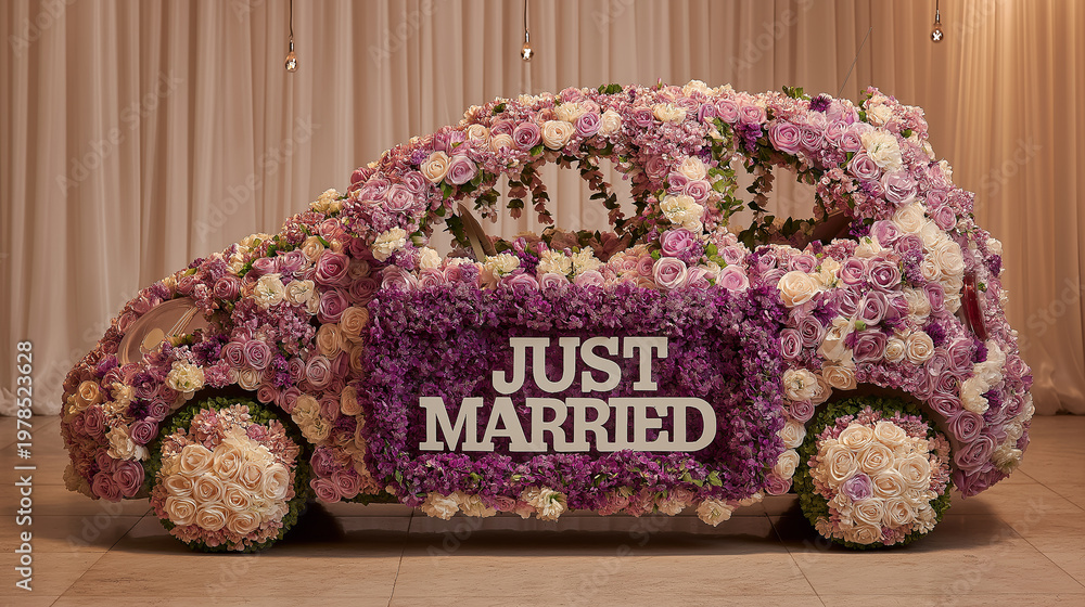 Beautiful wedding car with plate text wit flower frame JUST MARRIED #1978523628