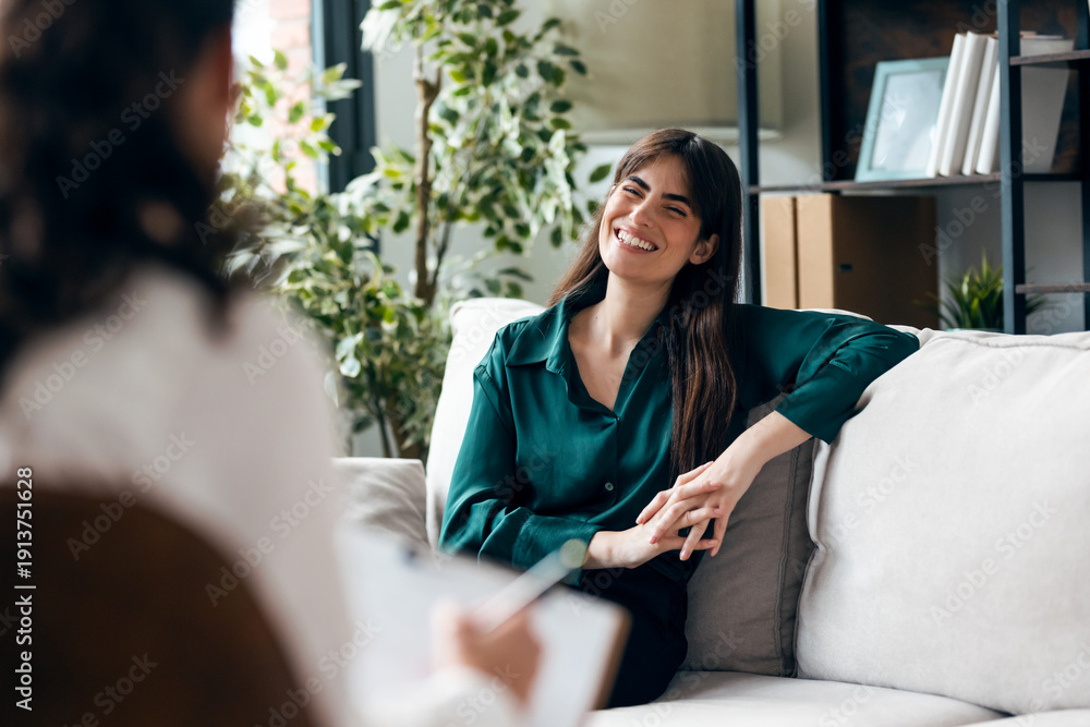 Beautiful woman having therapy while the psychologist takes notes, sitting on the couch in the psychology office #1913751628