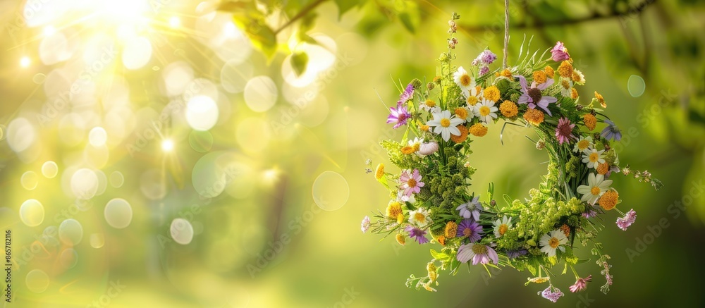 Beautiful wreath made of wild flowers hanging from a tree against a sunny green backdrop, #865782116