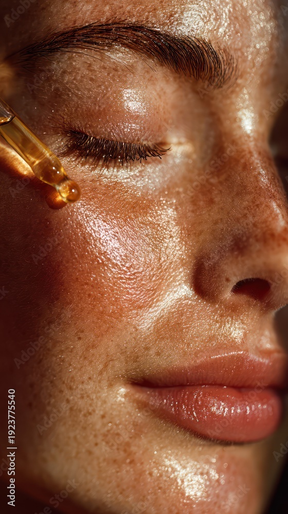 beauty shot of a serene young woman golden serum droplet onto her cheek #1923775540