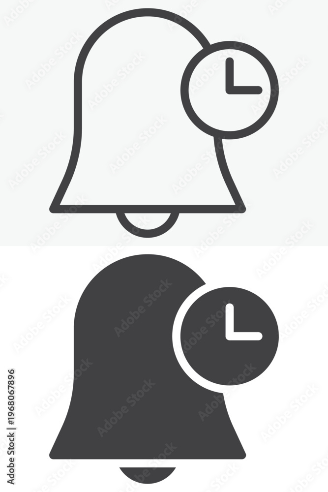Bell Clock Notification icon in line, outline and solid style. Editable stroke vector sign and symbol set for time use, with bell clock notification icon in simple versions. #1968067896
