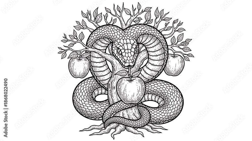 biblical serpent snake on apple tree sketch engraving vector illustration T-shirt apparel print desi #1868022490