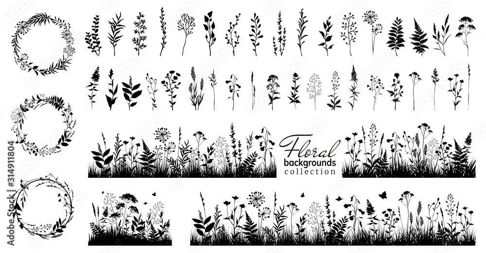 Big floral collections of black silhouettes of meadow herbs, floral backgrounds and wreaths. Wildflowers. Wild grass. Floral elements for your design. Vector illustration. #314911804
