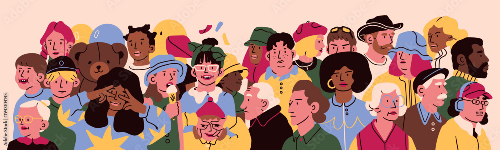 Big set of different age people stand side by side. Diverse multicultural, multiracial people. Cute characters. Family, teamwork, togetherness, community concept. Hand drawn trendy Vector illustration #1943104145