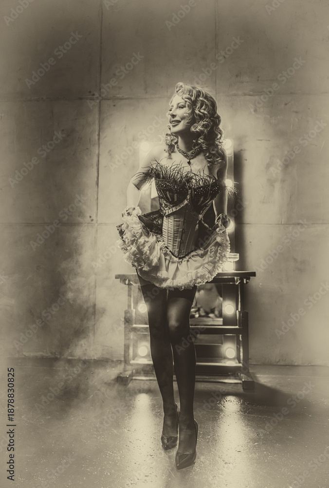 black and white color photo Beauty blonde hair retro lady playful girl fashion model in short dress lush skirt. sexy woman burlesque show dancer actress. Flapper girl 20s roaring twenties old style #1878830825