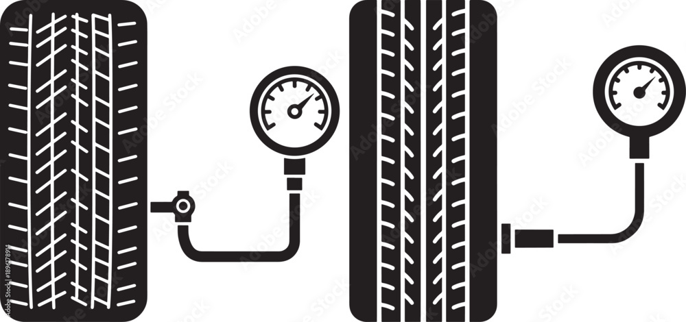 Black and white illustration of car tires and tire pressure gauges, signifying vehicle maintenance and inspection #1896178914