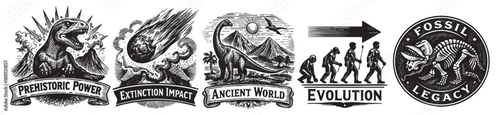Black and white line art illustrations depicting dinosaurs, evolution, and prehistoric events, ideal for educational materials, history projects, or scientific publications. #1881131857