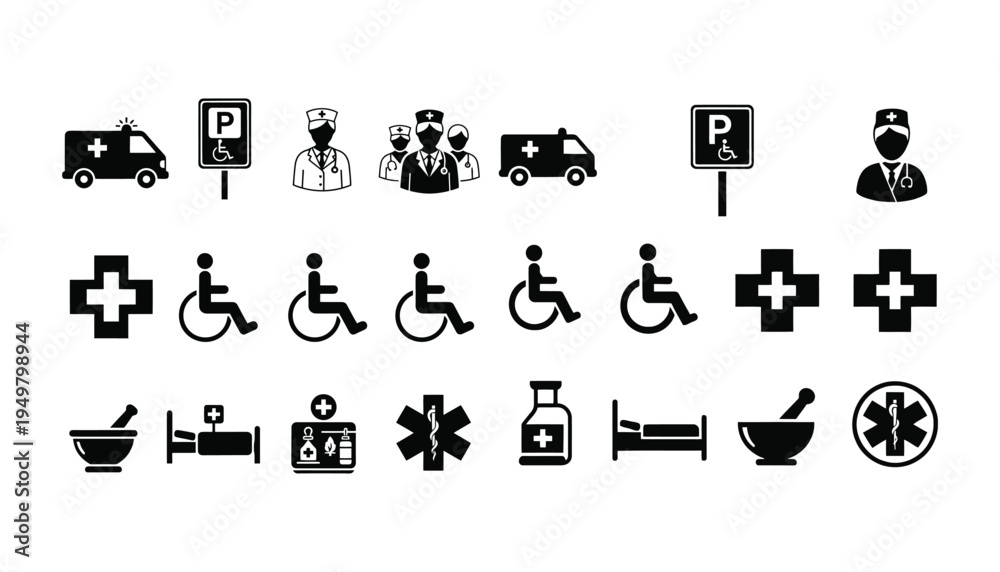 Black and white medical icons depicting healthcare accessibility and emergency services #1949798944