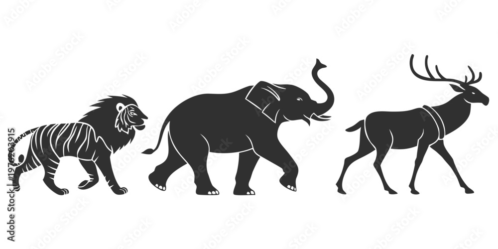 Black and white silhouettes of a walking lion elephant deer isolated on white background side profile big five silhouette elephant wildlife isolated #1976203915