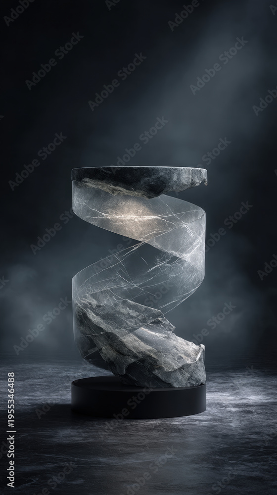 Black and white spiral abstract sculpture on pedestal, modern gallery decor piece #1955346488