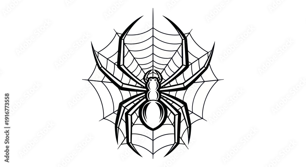Black and white vector illustration of a spider and its web on white background #1916773558