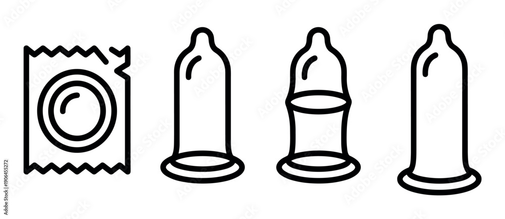 Black line art condom icon set showing a wrapper and unrolled contraceptive for safe sex education, presented in a simple, minimalist graphic illustration style #1906455272