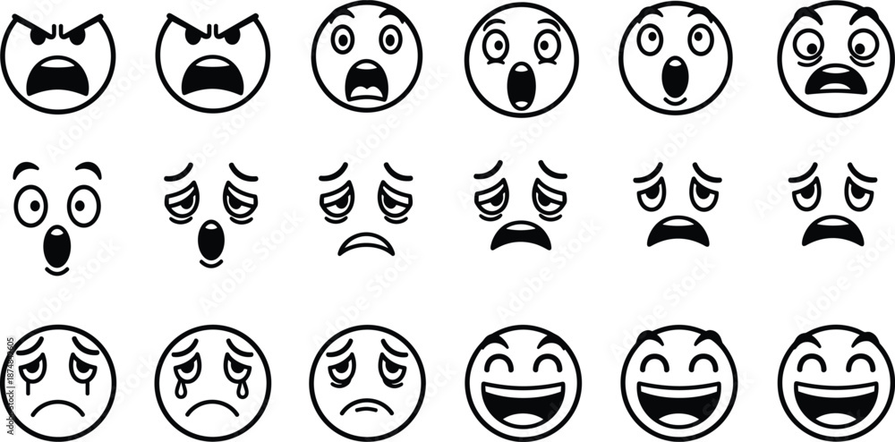 Black outline emoji faces set showing angry surprised sad happy emotions, simple cartoon expression icons collection for apps stickers web design #1874842605