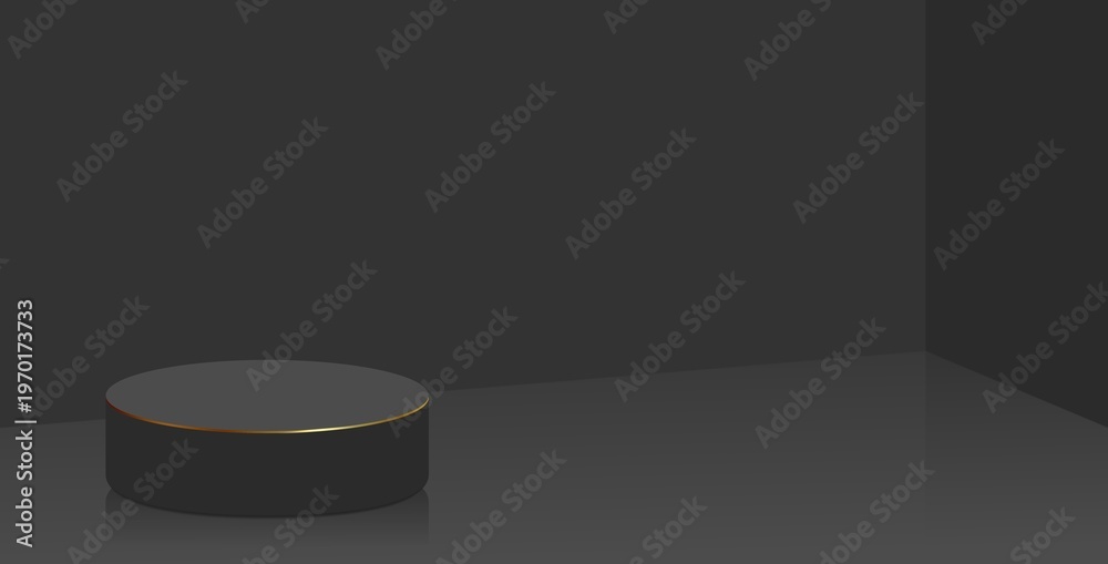 Black round podium is decorated with thin gold rim and stands on smooth floor in black room. Empty plain background 3d. #1970173733