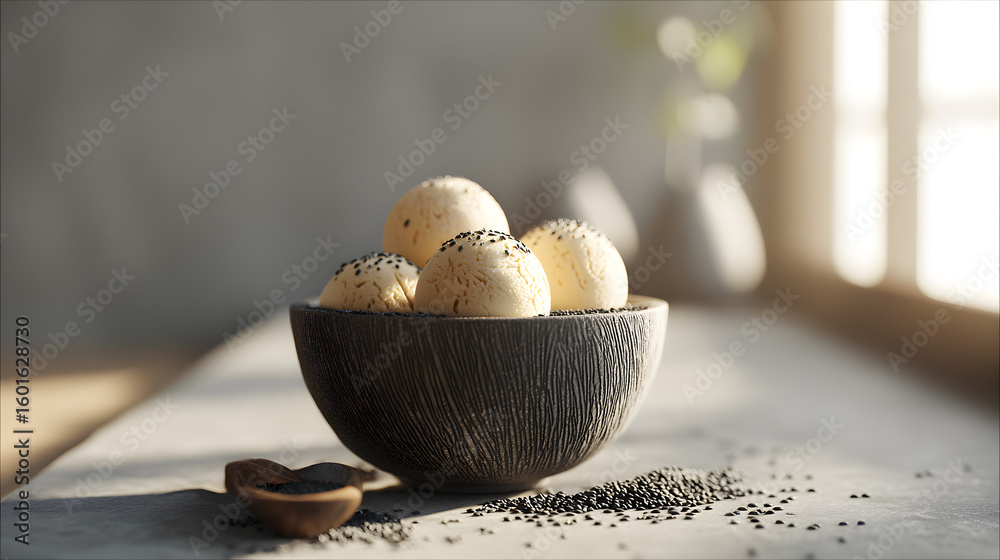 Black sesame ice cream scoops in a textured ceramic bowl #1601628730