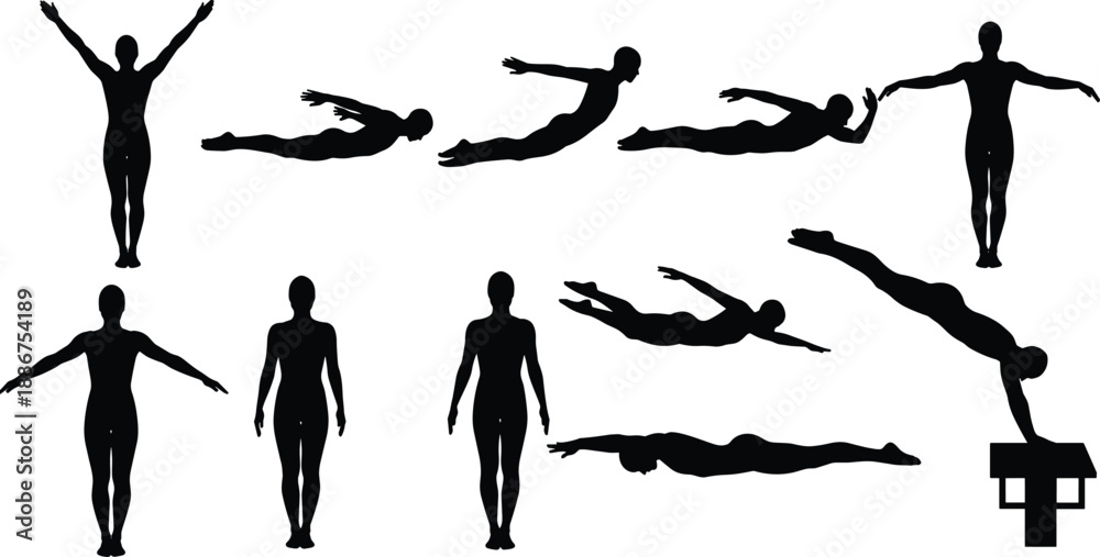 Black silhouettes of male swimmers and divers in various athletic poses, professional swimming competition techniques and diving positions set, isolated vector illustration, white background #1886754189
