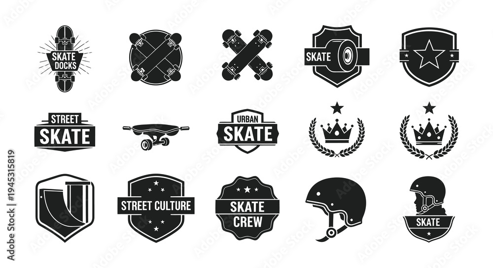 Black White Skateboarding Logos and Icons, Street Culture Emblems #1945315819