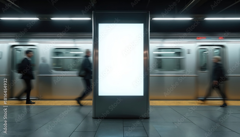 Blank billboard in subway. Vertical banner near passing train with motion blur. People walk by. Mock up template for advertisement design or marketing campaign in metropolitan transport. #1816454932