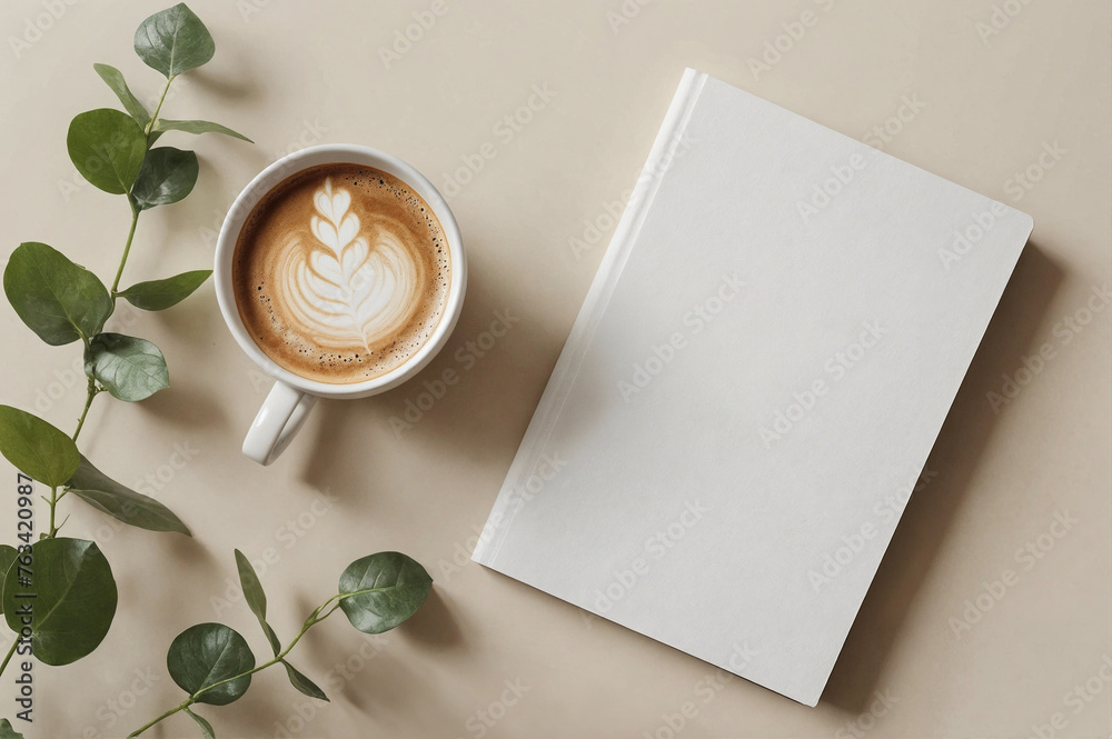 Blank book cover template laying on beige background with a cup of coffee and eucalyptus branch. Front, top view of empty book mockup in cosy environment and pastel colours #763420987