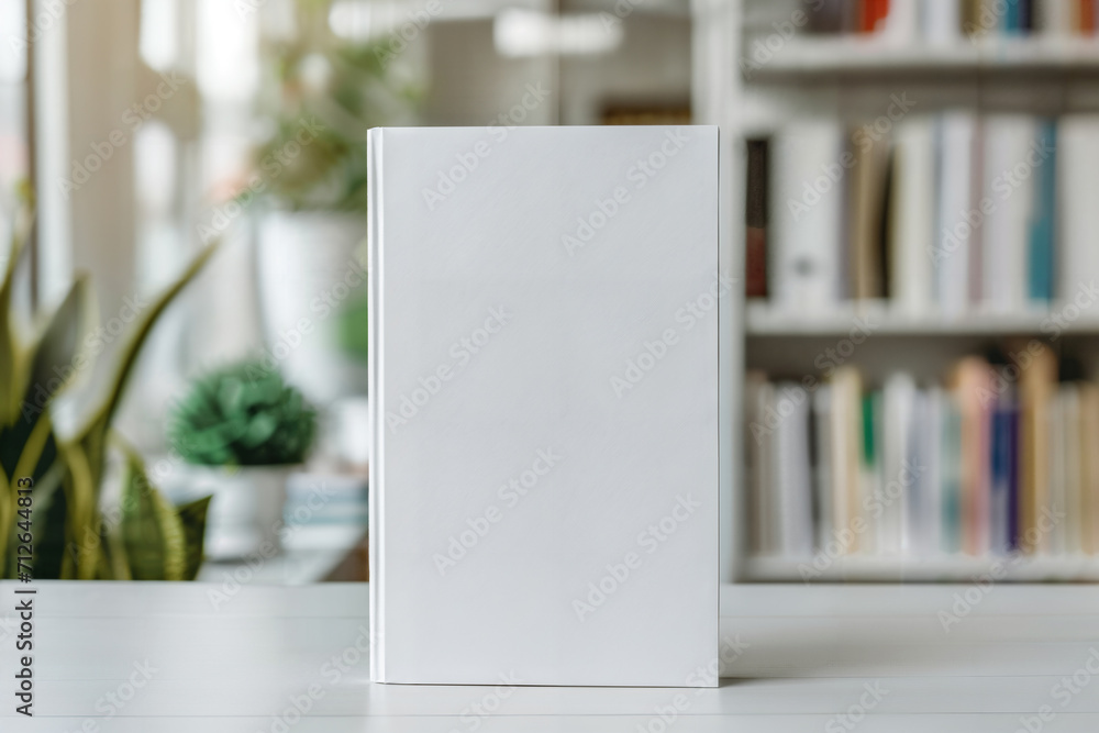 Blank book cover template standing on wooden surface againts blue blurred background with book shelfs. Front view of magazine mockup #712644813