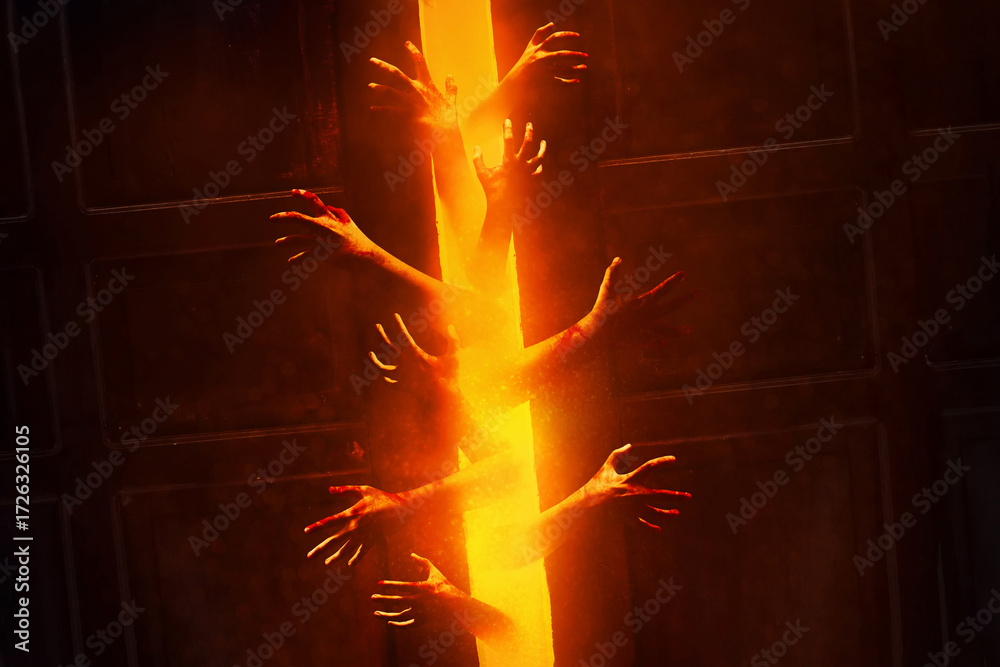 Bloody zombie hand rising out of the door, Halloween theme #1726326105