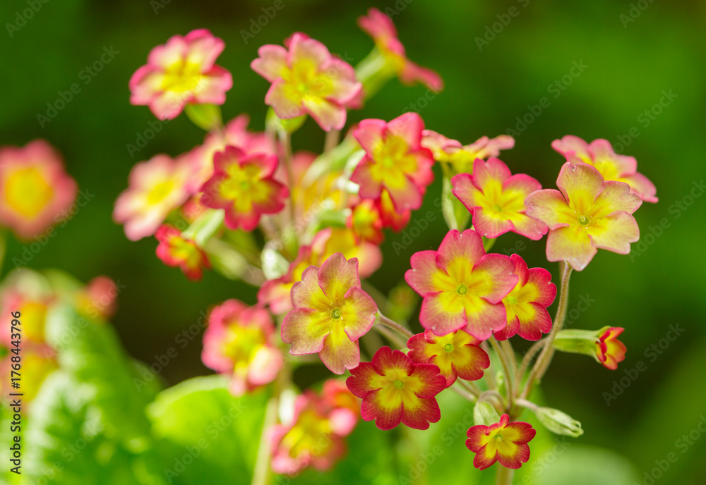 blooming of colorful primula flowers in a garden #1768443796