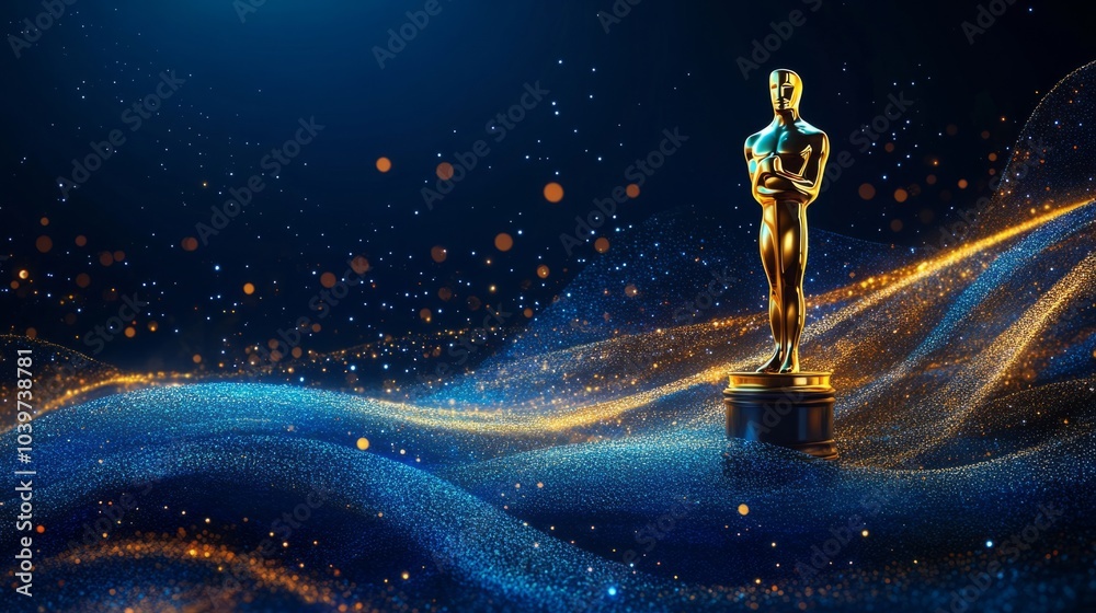 Blue award background with golden lines and abstract shape of the cinema awards statue for sunset light, elegant presentation design background #1039738781