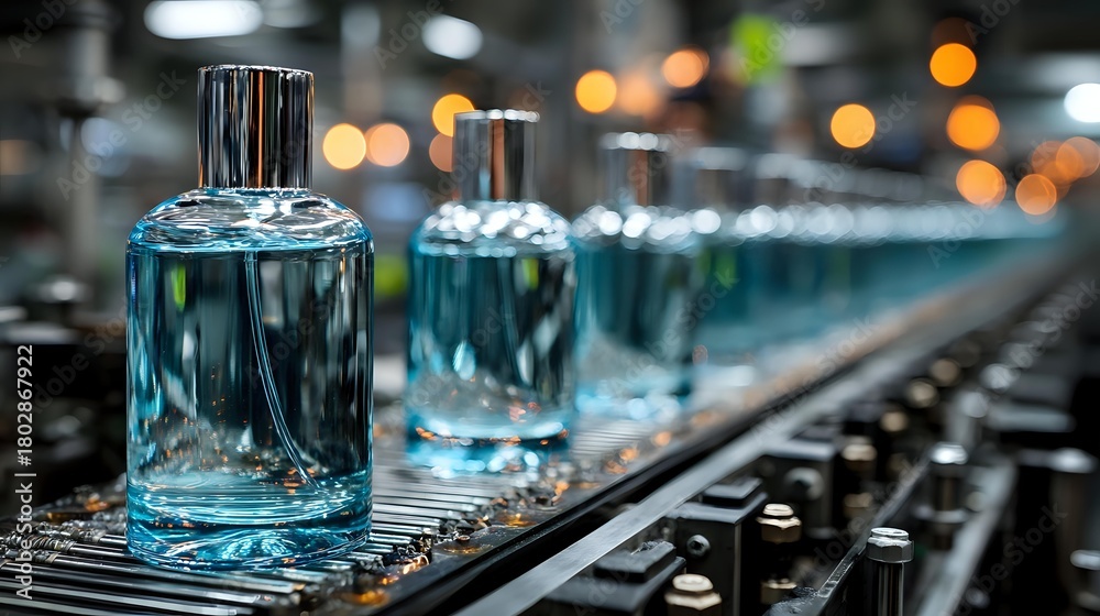 Blue perfume bottles on production line conveyor belt in fragrance manufacturing facility with blurred lights in background. #1802867922