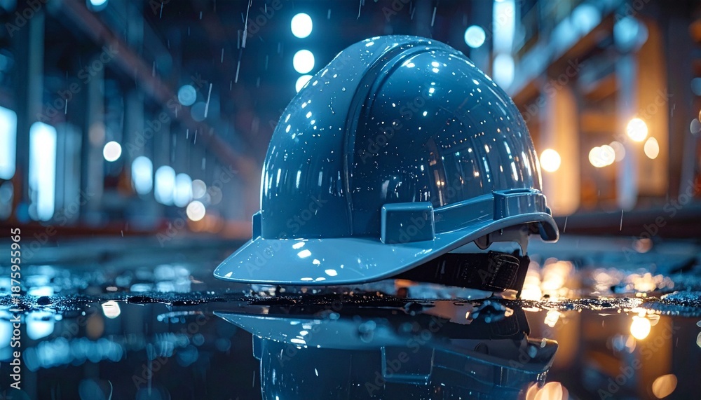 Blue Safety Helmet Resting In Puddle Reflecting Industrial Interior Under Rain #1875955965