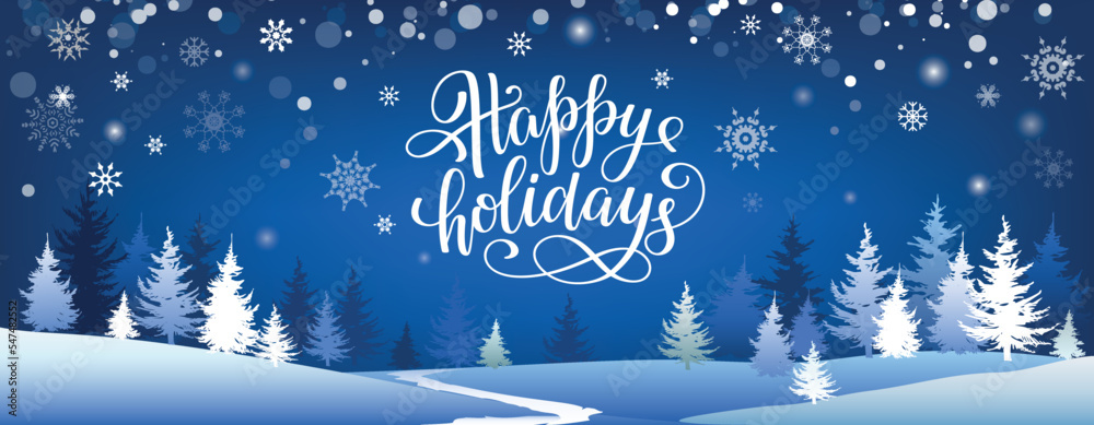 Blue winter background. Merry Christmas postcard template with winter forest and lettering phrase Happy Holidays. Festive banner. #547482552
