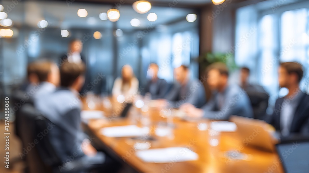 Blurred corporate setting showcases team meeting around boardroom table with warm lighting in professional environment #1574355060
