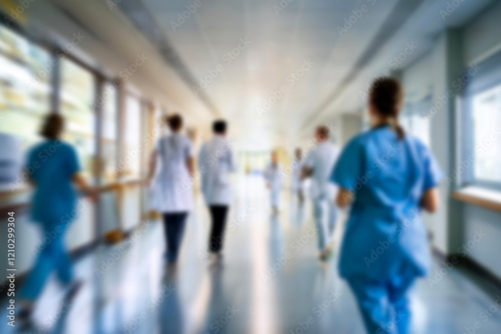 blurred for background. blurred figures of doctors and nurses in a hospital corridor. Doctors and nurses walking in hospital hallway. blurred motion. Moving human figure in the clinic corridor #1210299304