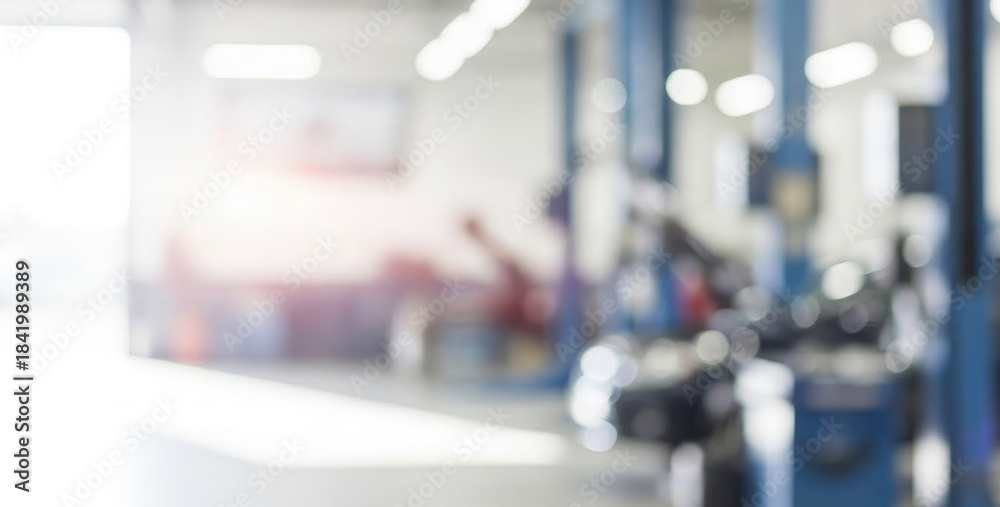 Blurry interior view of a bright automotive repair garage with lifts, enhanced by warm diffused lighting and soft indistinct shapes that create a calm spacious atmosphere. #1841989389