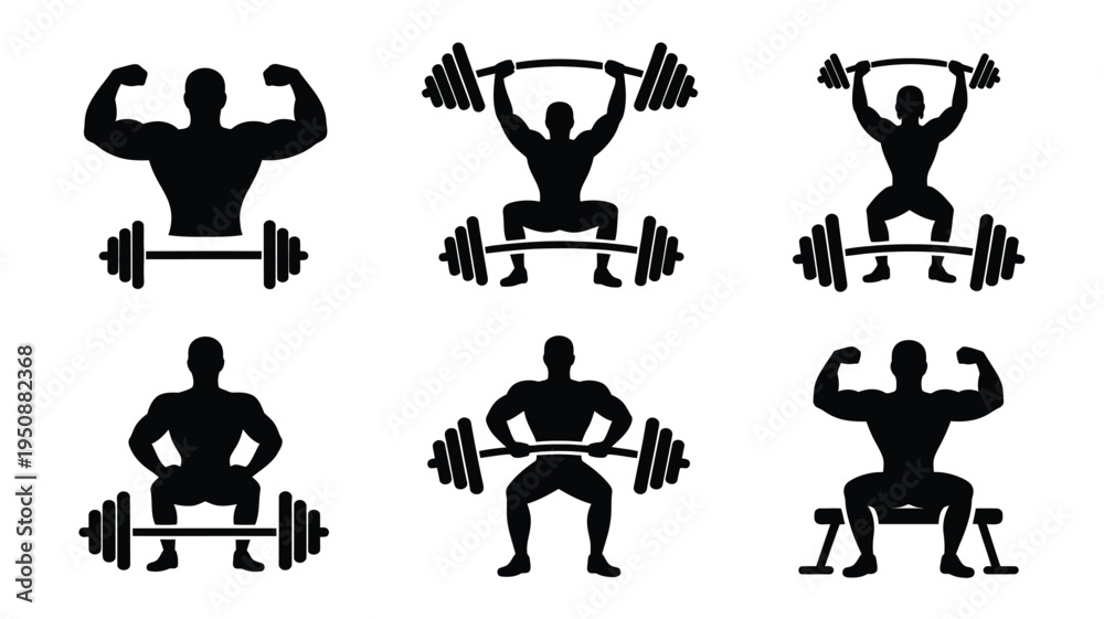 Bodybuilding silhouette icon set with six black gym workout figures lifting dumbbells and barbells on white background #1950882368