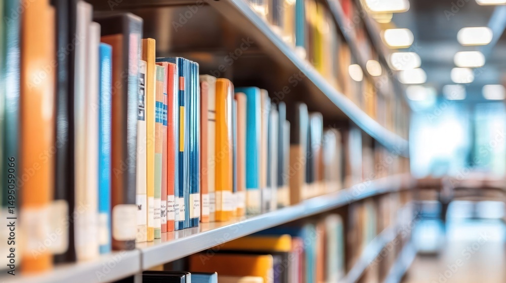 Books lined up on metal library shelves #1495059066