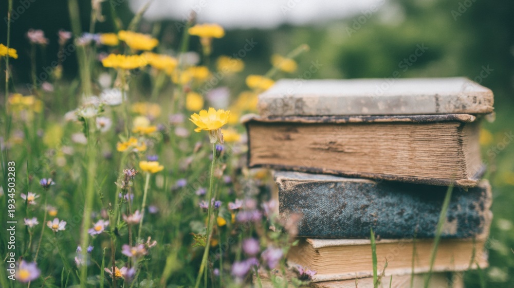 Books placed on grass surrounded by yellow and purple flowers in spring #1934503283