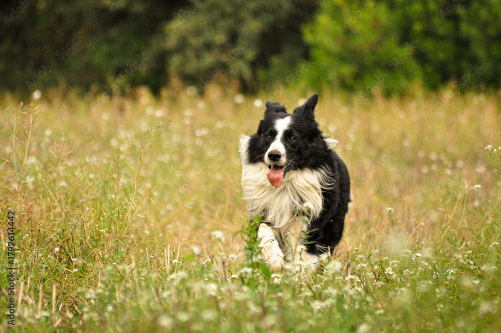Border collie dog running and jumping through a flower meadow #1792614442