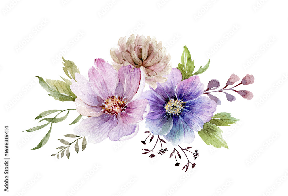 Bouquet of pink and lilac flowers, isolated watercolor hand drawn illustration #1698319414