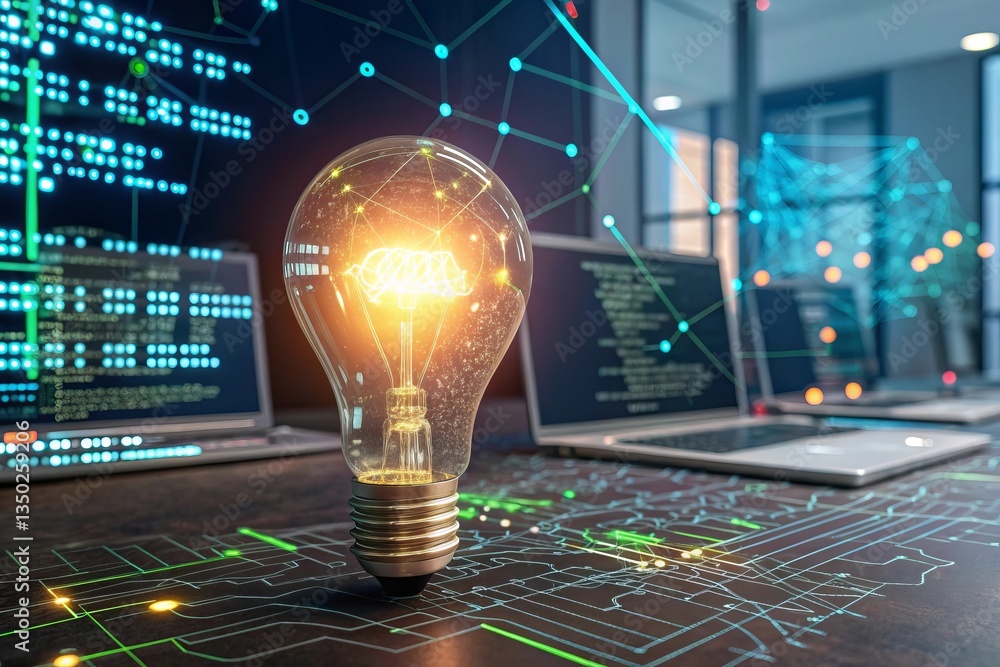Breakthrough algorithms illuminate innovative ideas in a modern workspace with glowing light bulb and advanced technology #1350259206