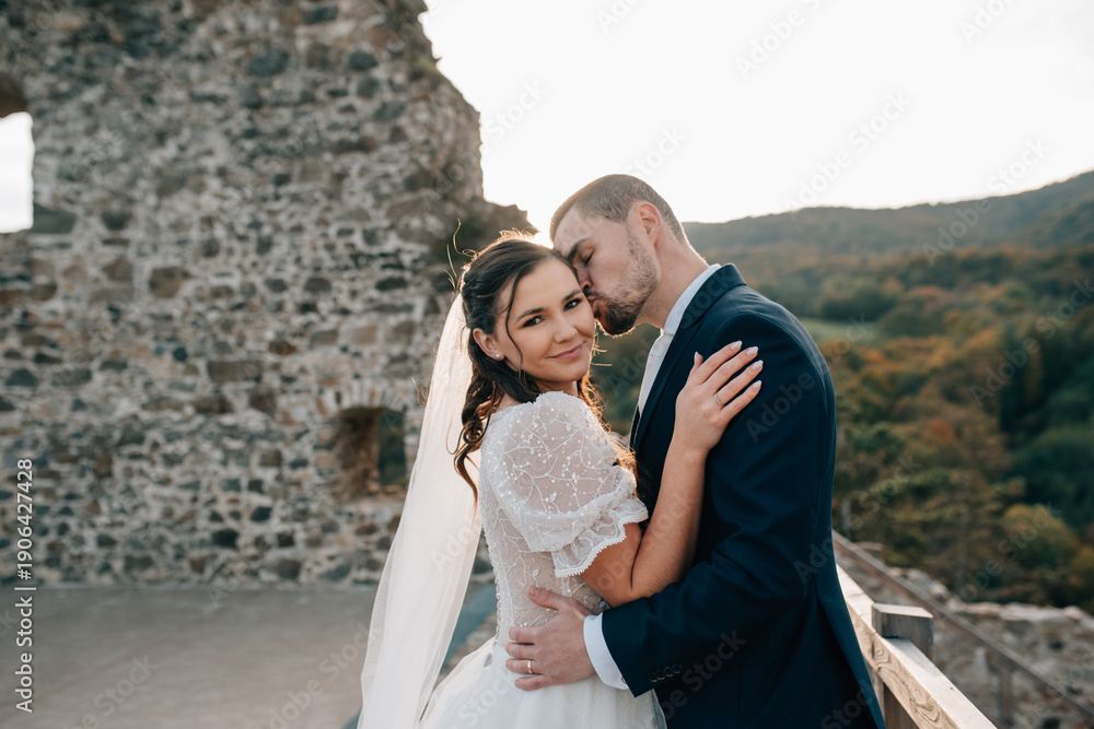 Bride and groom dancing, looking at each other. Wedding couple standing outside near ruins. #1906427428