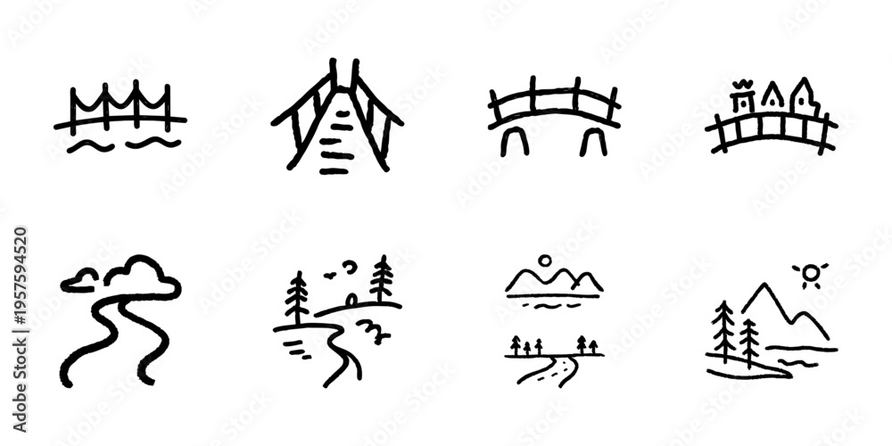 Bridges And Landscapes In Hand Drawn Style Set. Nature Exploration, Scenic Views, Outdoor Adventure Doodle Sketch Collection. Rustic Charm, Travel Inspiration. Isolated Vector Illustration #1957594520